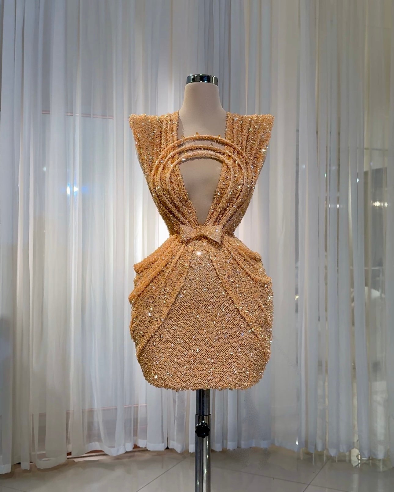 A rich golden-beige hue with shimmering sequins or embellishments throughout, giving it a glamorous and radiant effect.The bodice is designed with a bold, sculptural silhouette featuring circular, layered details framing the chest area.The dress is haute couture in style, showcasing intricate craftsmanship and a structured, figure-flattering silhouette meant for special occasions or red carpet events. It exudes luxury and artistry.