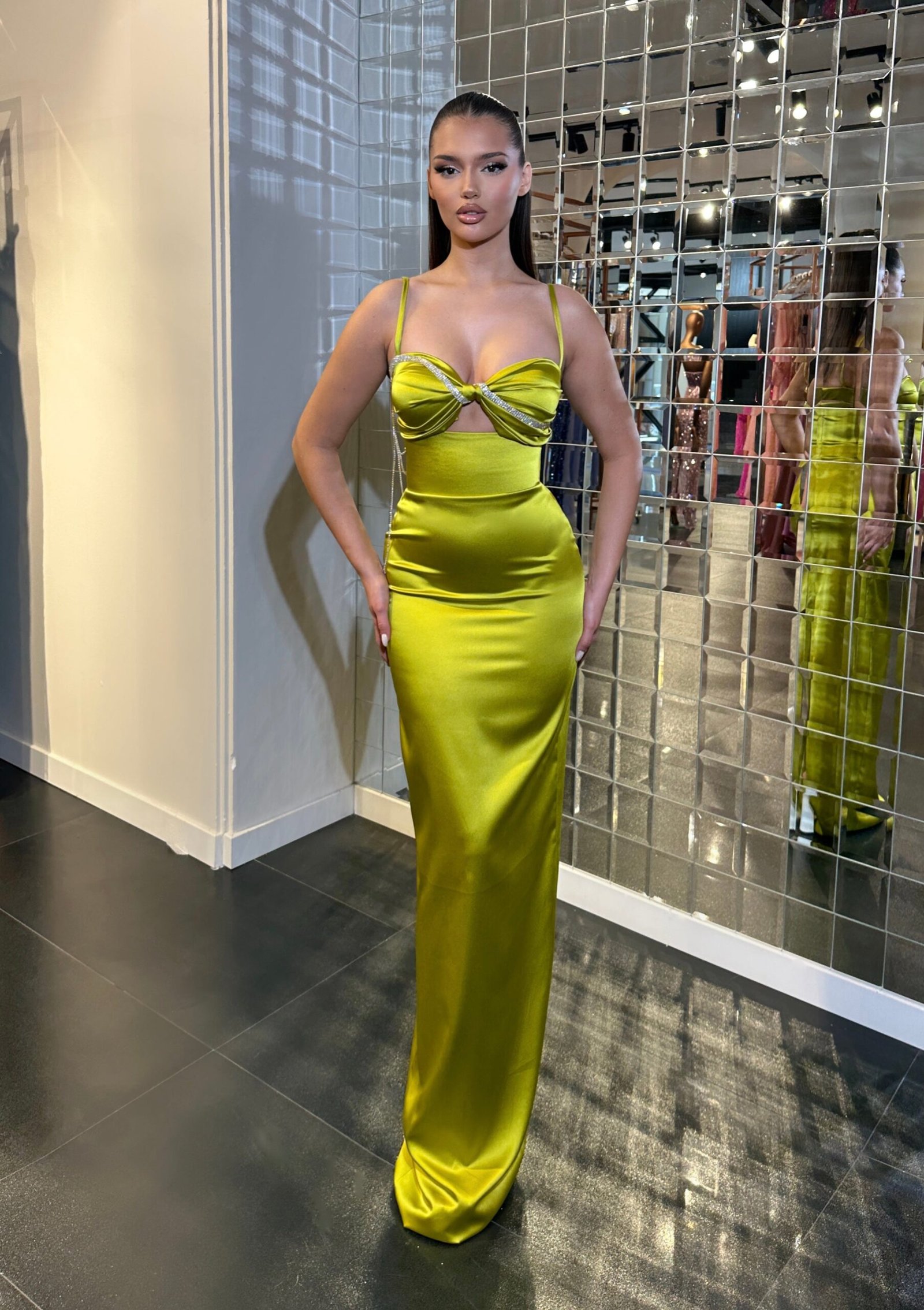 This long evening dress features a unique bodice with a sculptural twist at the bust, adding a modern edge to the classic strapless design. Its form-hugging nature accentuates the body’s natural curves, flowing seamlessly into a mermaid-style skirt that flares subtly at the hem, creating an elegant sweep as the wearer moves.