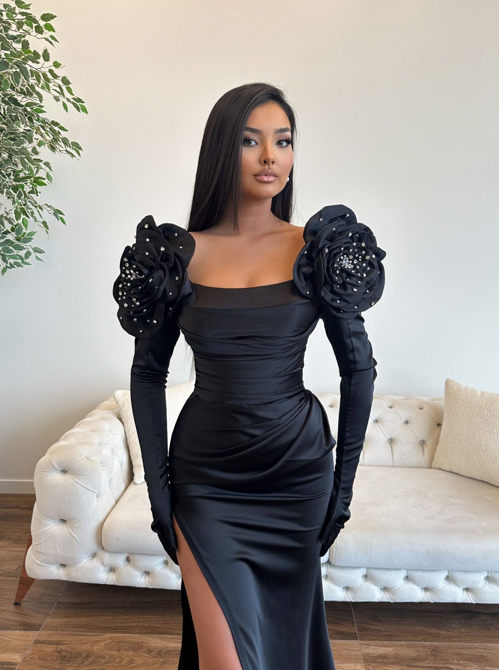A rue work of art, encapsulating the essence of luxury and sophistication in evening wear. Handcrafted with a focus on detail, it features dramatic shoulder embellishments that create a bold, glamorous statement. The elegant off-the-shoulder neckline and fitted silhouette highlight a sexy yet classy charm, while the high slit adds a modern edge to this long evening dress.