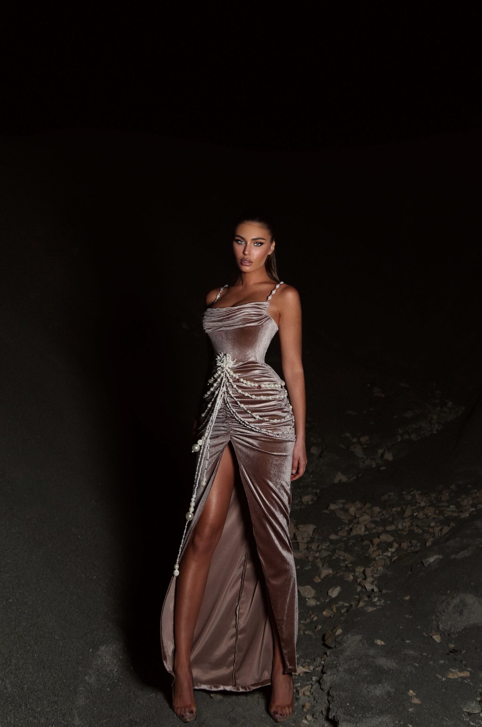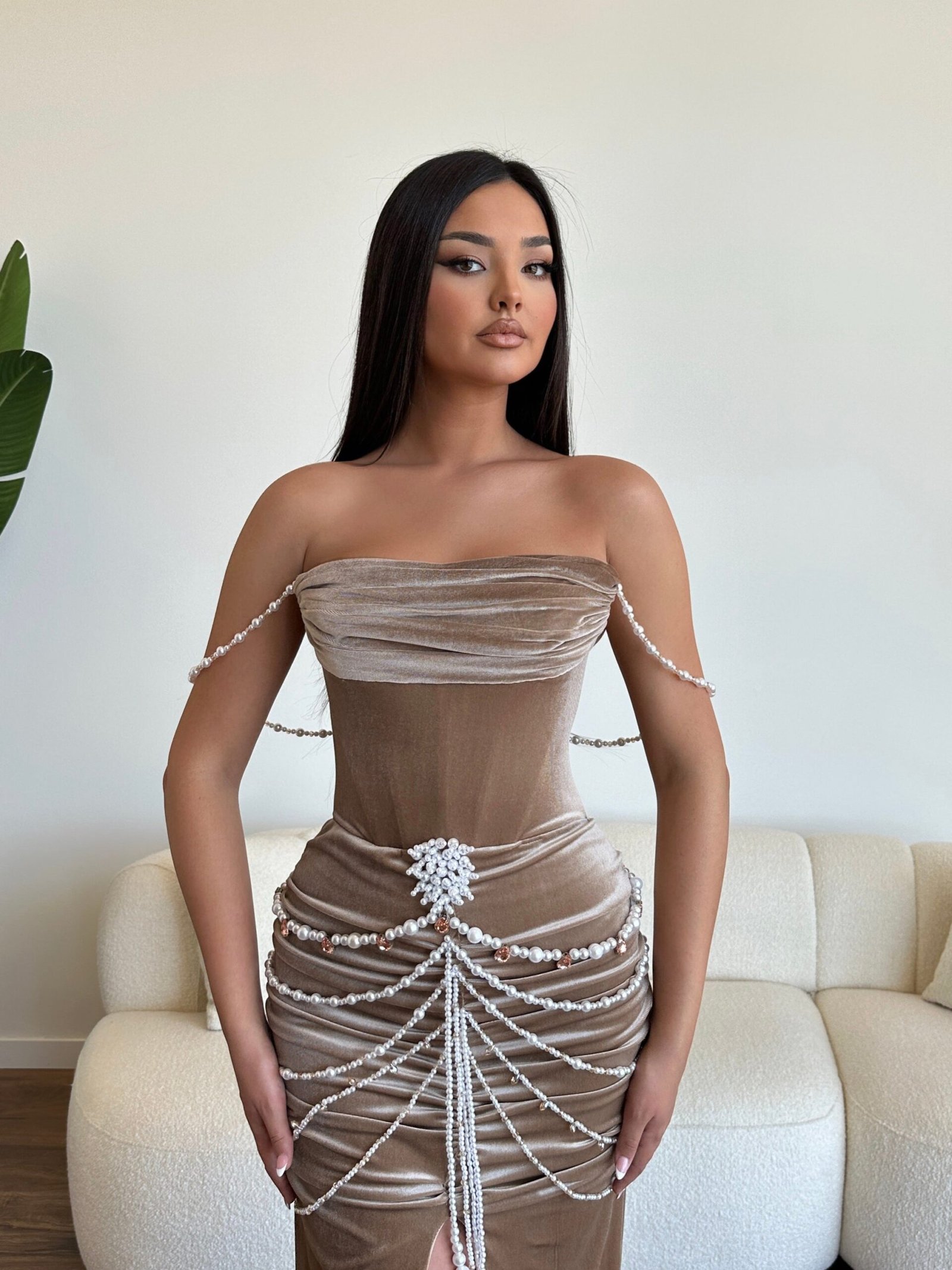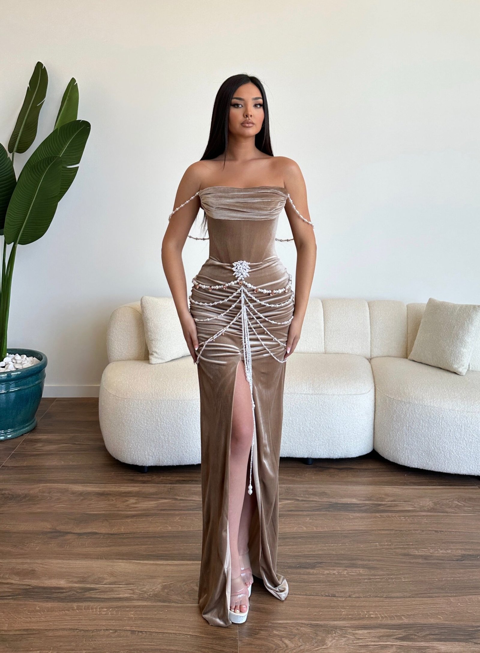 The “Brownie” long brown velvet dress features pearl stripes whereas the bust and bottom of the dress are ruffled, and it also features beaded details on the bottom of the dress and a front slit. If you want to wear something unique, consider a dress decorated with pearls, like the “Brownie” dress from the “Larmes De Joie” Collection. It’s ideal for events like parties and cocktails, prom nights, and any other special occasion.