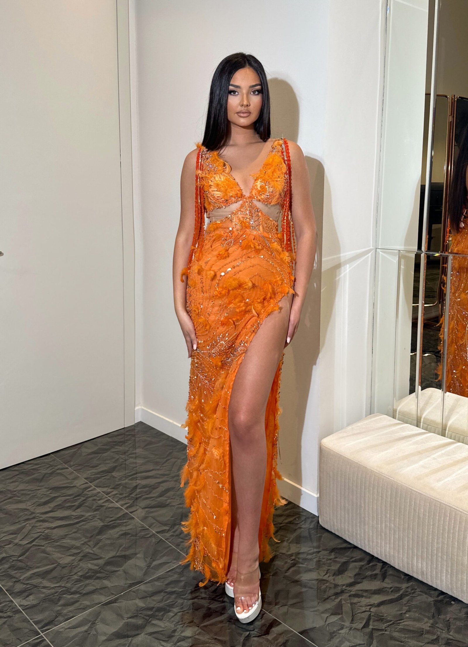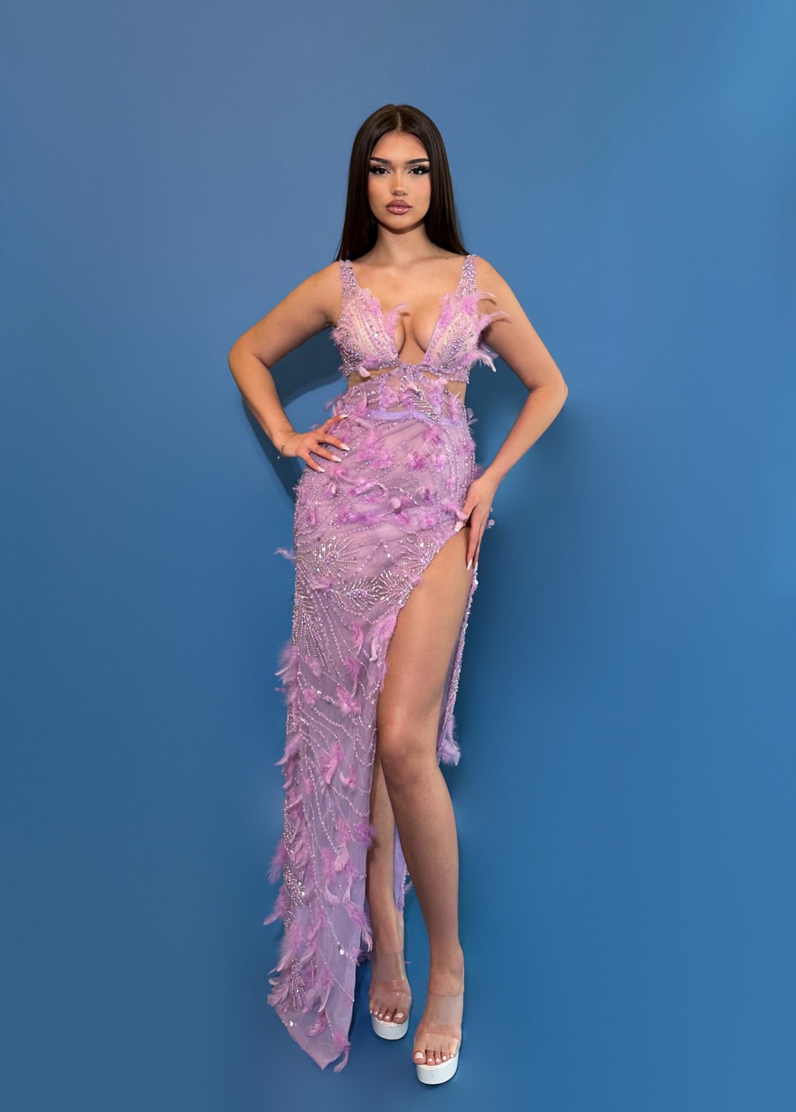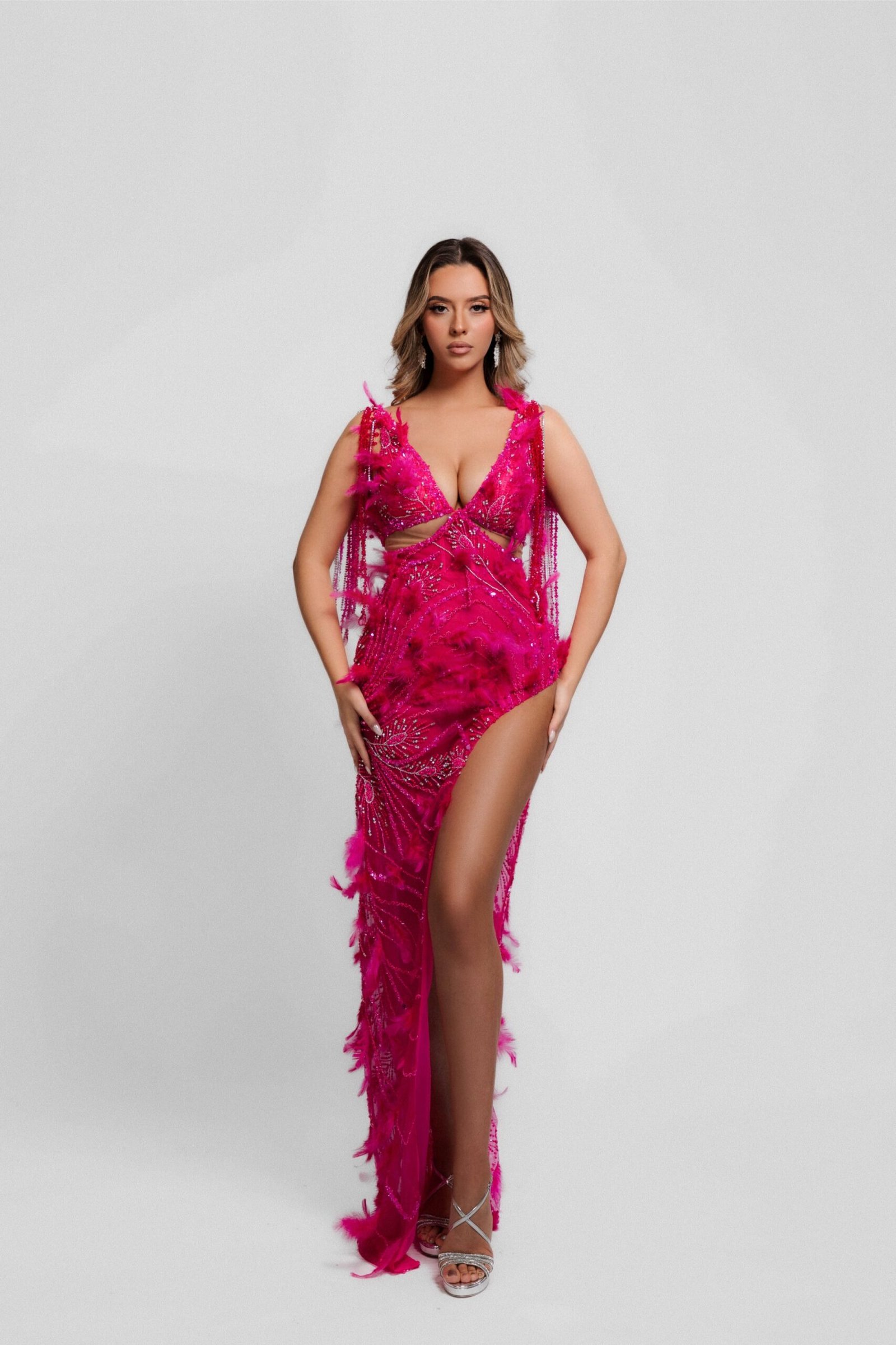 The dress in the image is a striking, full-length evening gown featuring a rich fuchsia color. It’s adorned with intricate beading and sequin embellishments that give it a luxurious and sparkling appearance. The design includes a deep V-neckline and a daring thigh-high slit that adds a touch of allure to the overall aesthetic. The gown is further enhanced by feather-like fringes that drape elegantly from the waistline and along the slit, providing a sense of movement and a flirty edge. Thin straps over the shoulders offer support while keeping the attention on the gown’s detailed work.