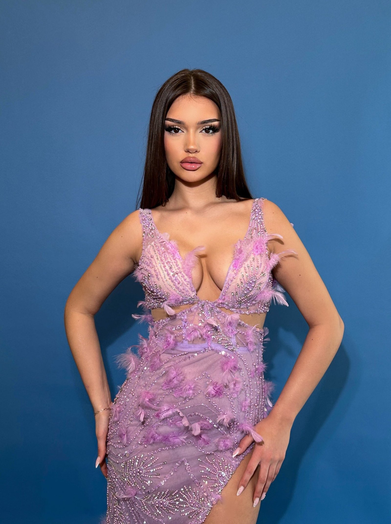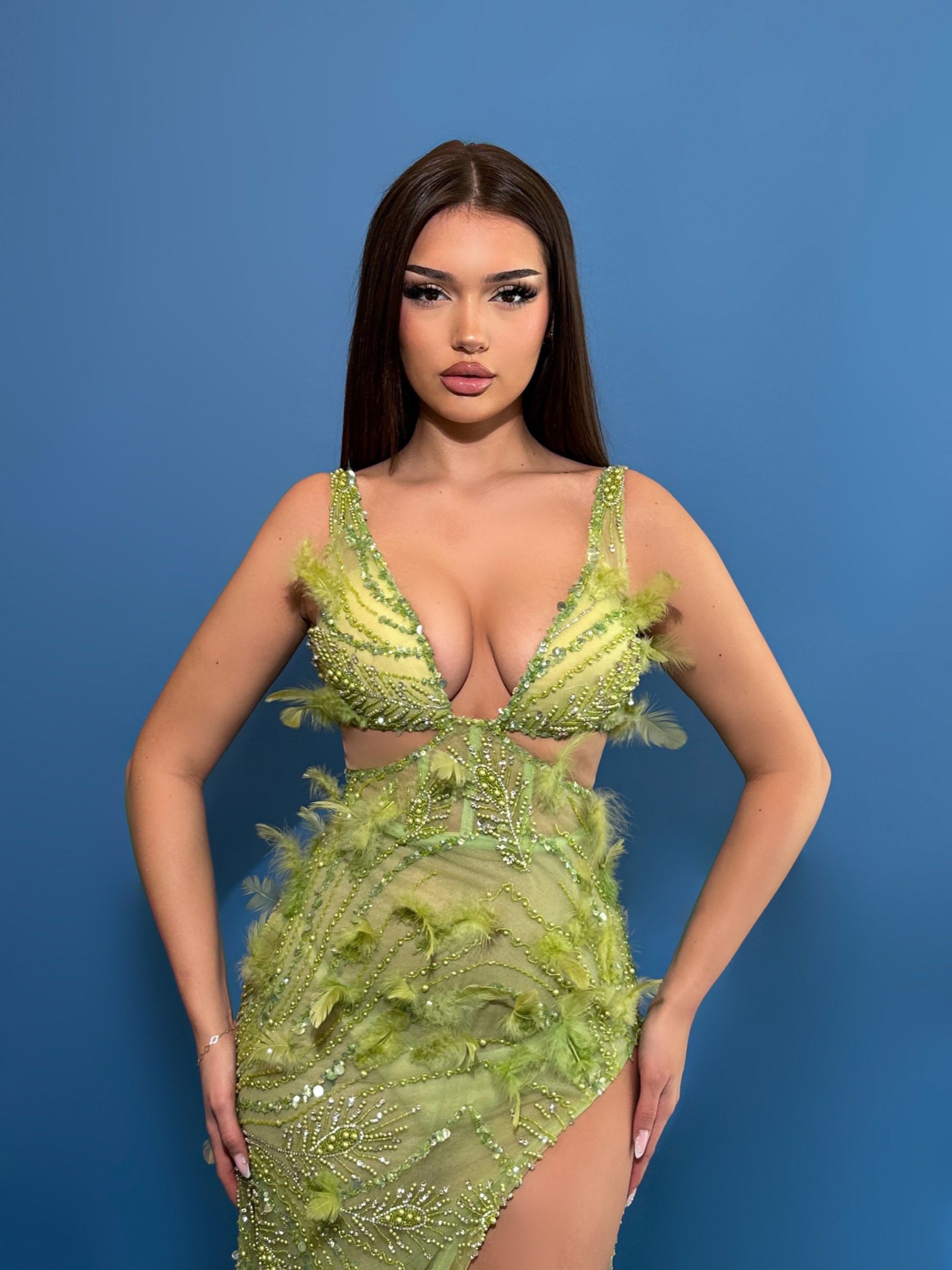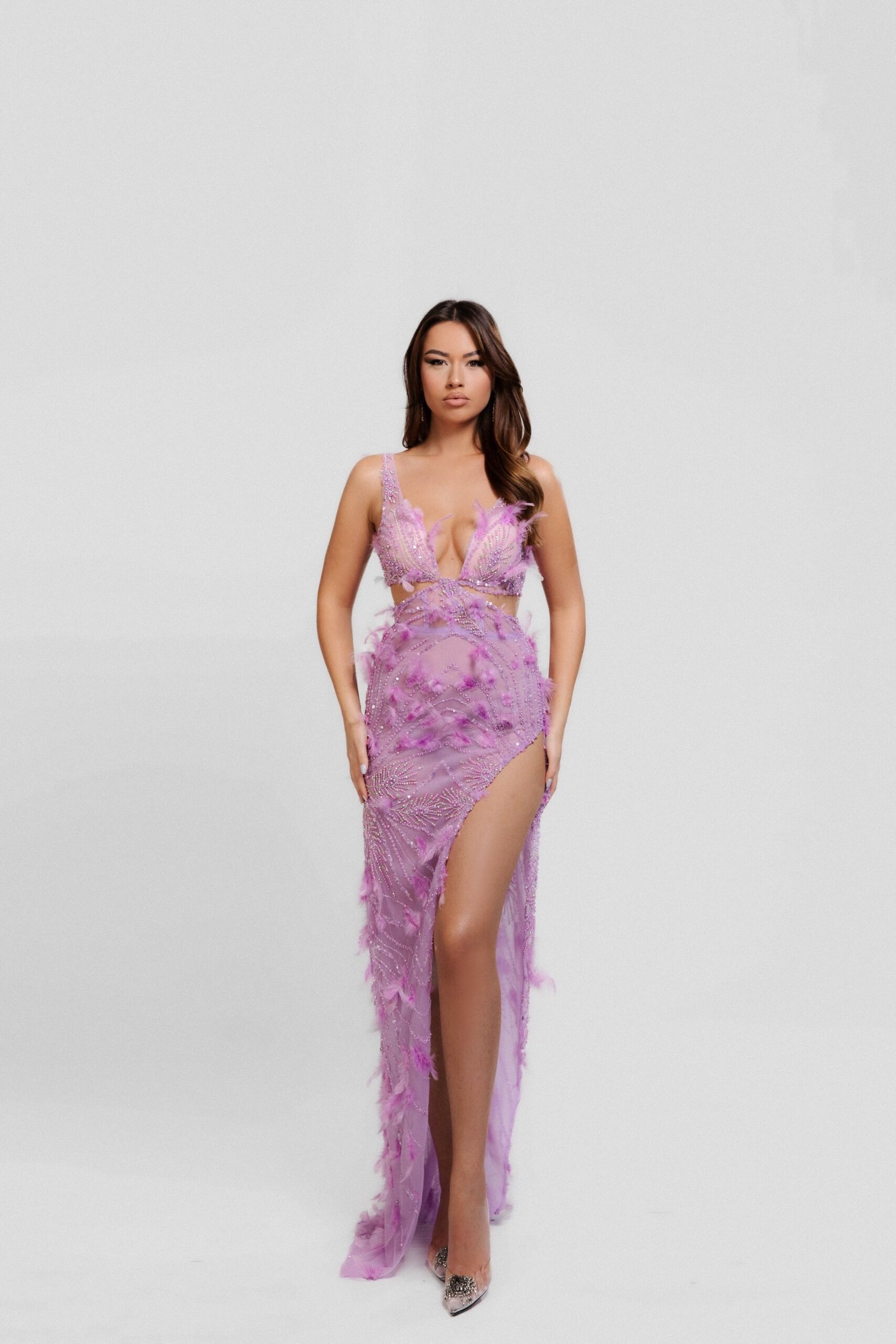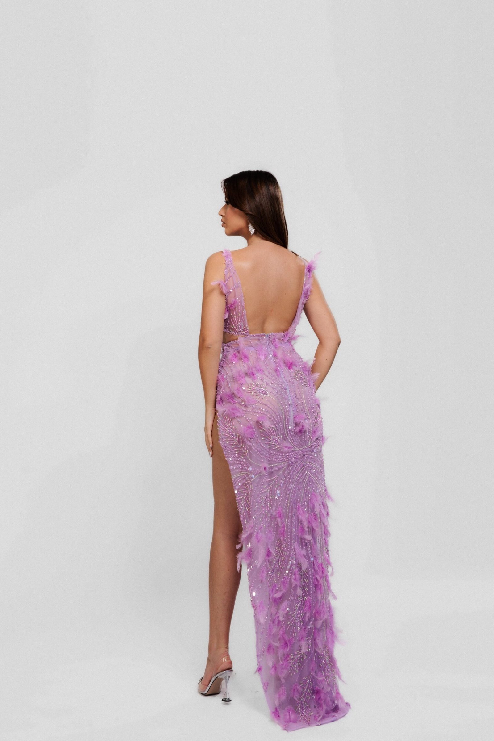 The dress in the image is a striking, full-length evening gown featuring a rich fuchsia color. It’s adorned with intricate beading and sequin embellishments that give it a luxurious and sparkling appearance. The design includes a deep V-neckline and a daring thigh-high slit that adds a touch of allure to the overall aesthetic. The gown is further enhanced by feather-like fringes that drape elegantly from the waistline and along the slit, providing a sense of movement and a flirty edge. Thin straps over the shoulders offer support while keeping the attention on the gown’s detailed work.