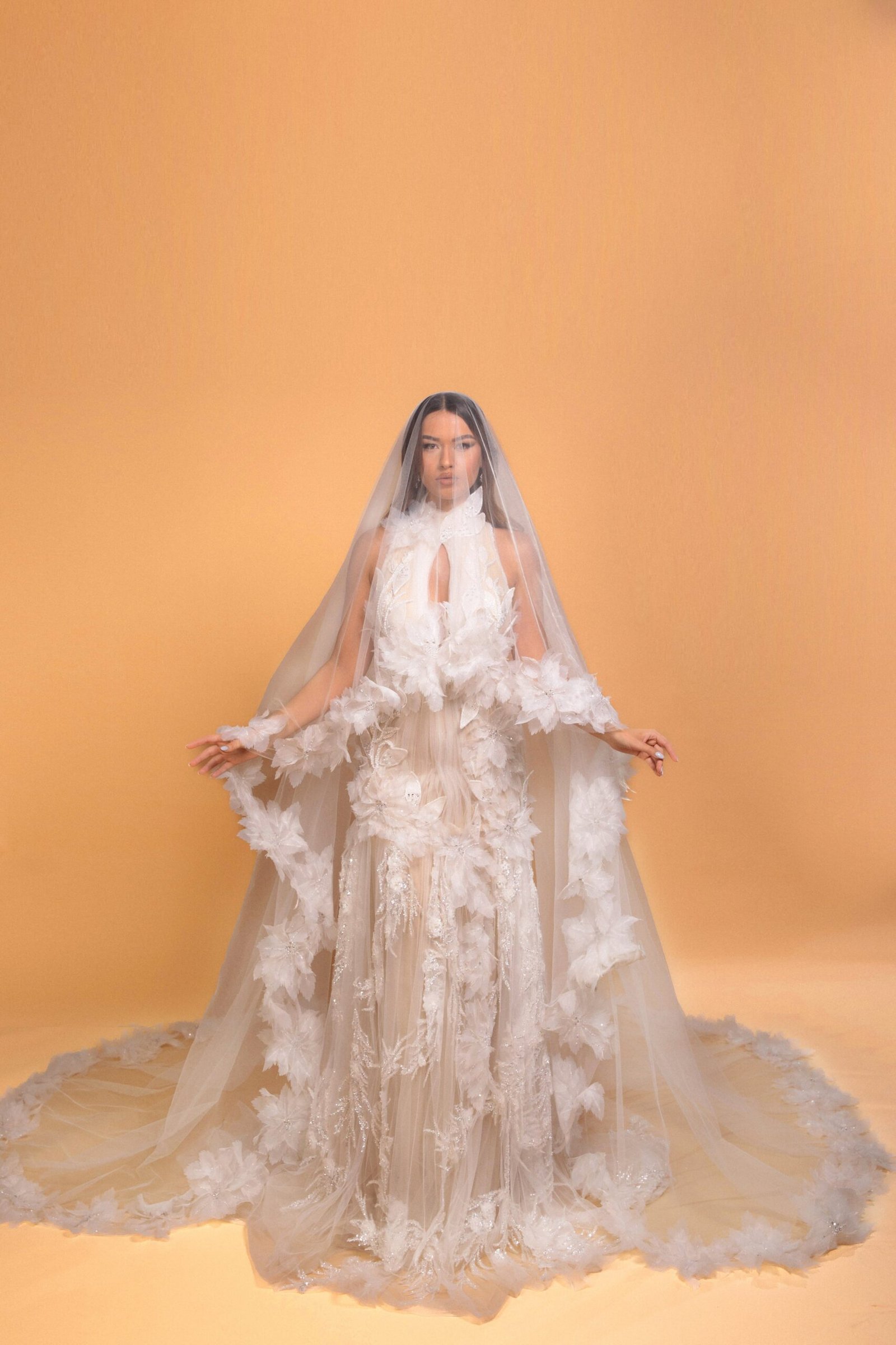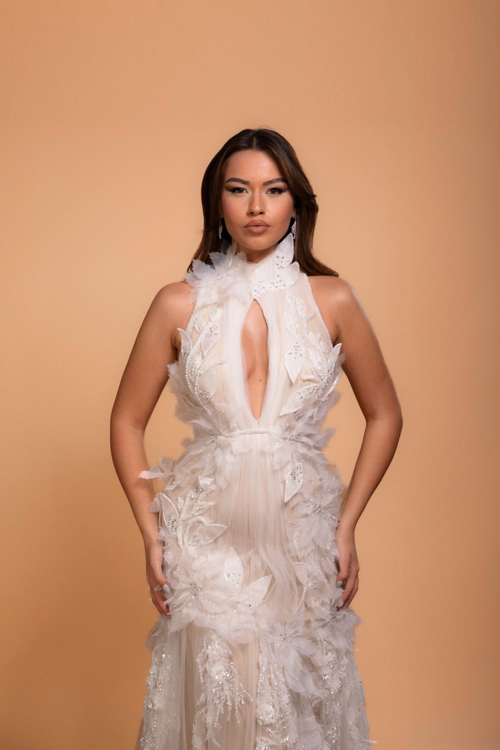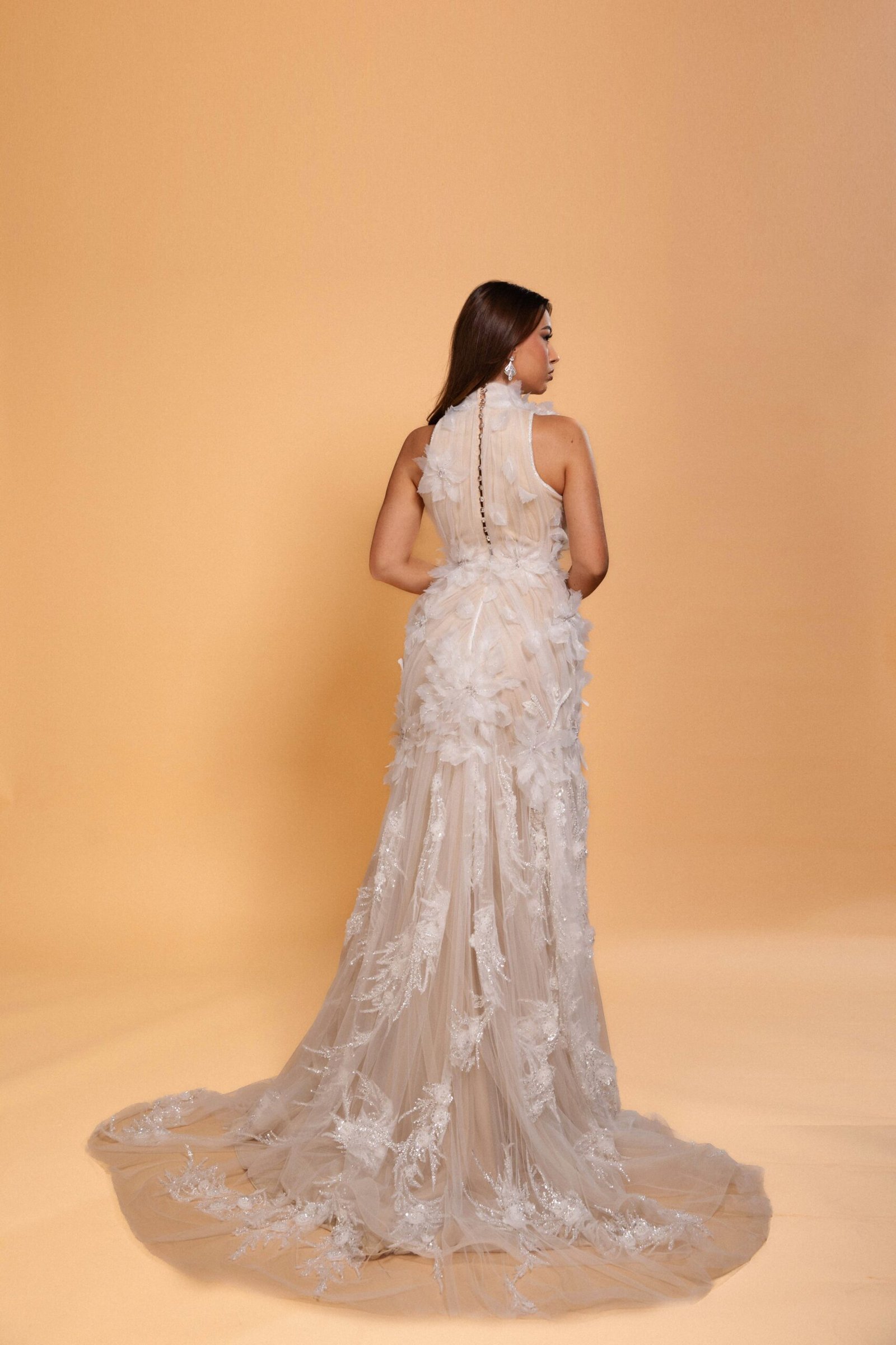This dress is a masterclass in handcrafted sophistication, designed for the most glamorous of evening events. Its high neck and sleeveless cut invoke a modern yet timeless elegance, while the sheer bodice, adorned with delicate appliques, offers a daring and sensual edge. Flowing effortlessly to the ground, the skirt blooms with layered applique detailing, adding a dimension of texture and romanticism. This piece is a true reflection of couture craftsmanship, perfect for anyone seeking a statement gown that marries daring design with classic luxury.