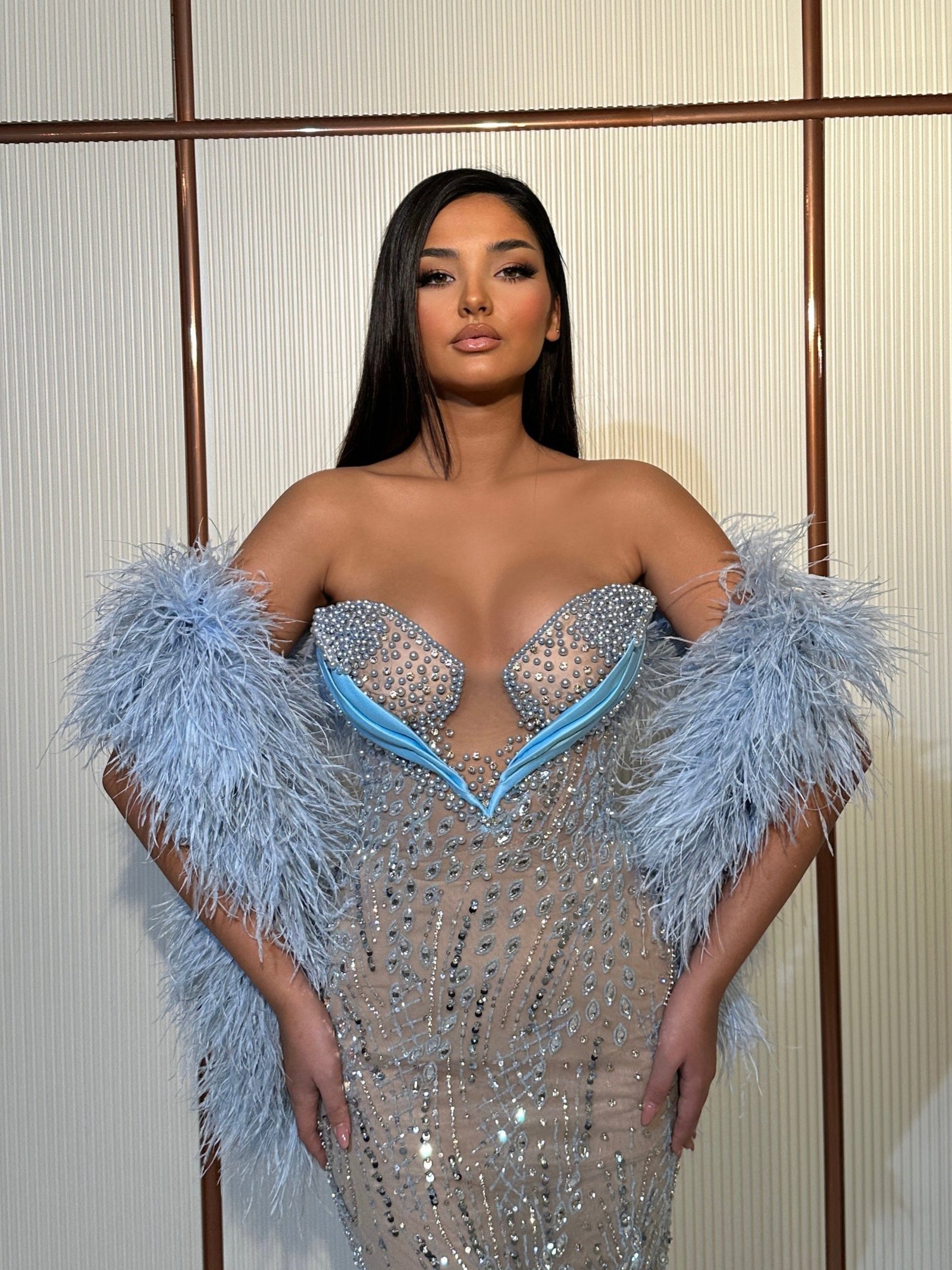Hugged by a cascade of soft, powder blue feathers that seem to flutter with every heartbeat, like the gentle wings of a lovebird. The Evangeline dress skims down the body, tracing your every curve before spilling into a graceful train, ready to sweep across the floor with all the mystery and allure of a midnight rendezvous. It’s not just a dress; it’s a love story in fabric and thread.