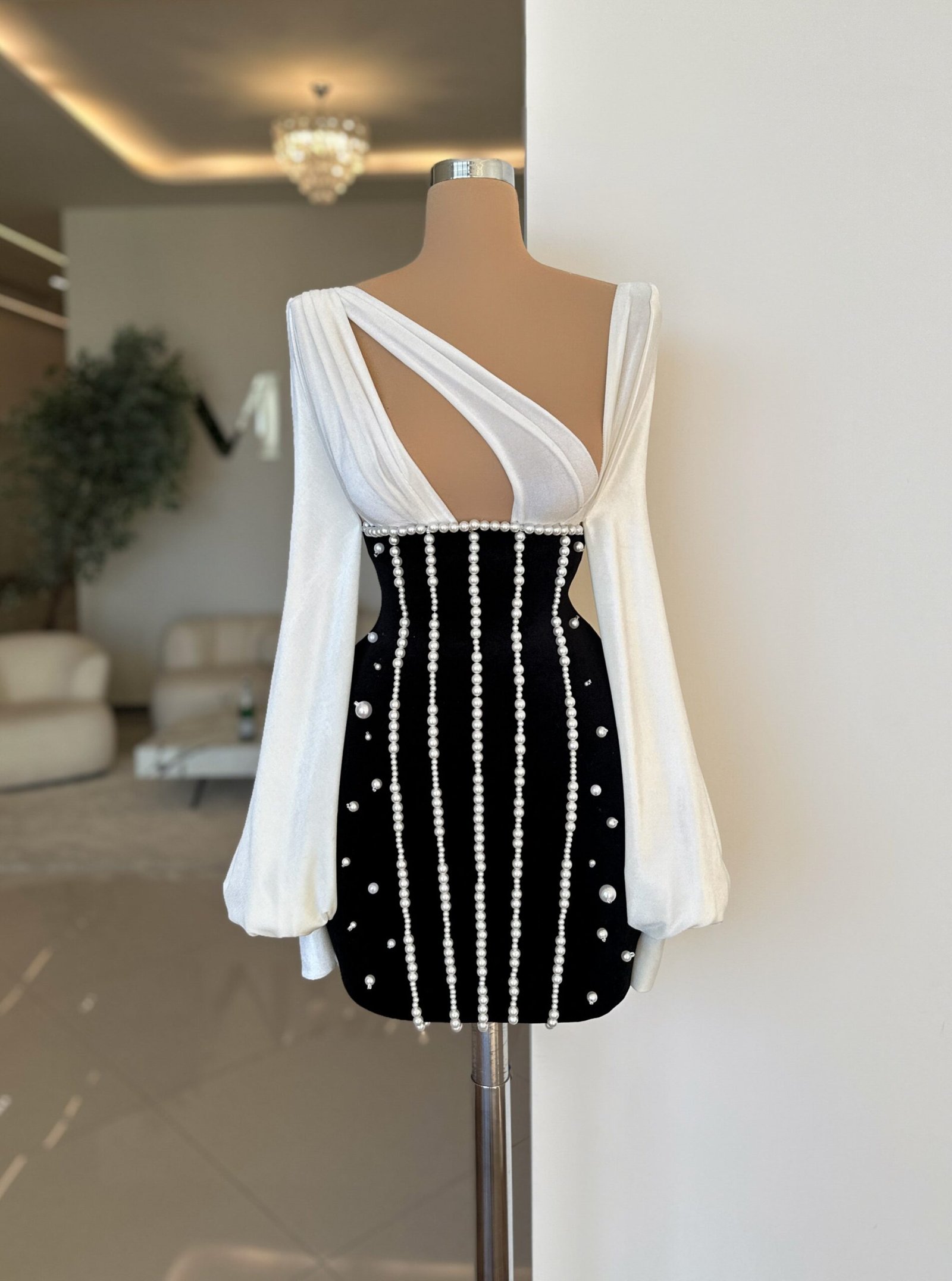 The black section of the dress is adorned with vertical lines of pearls, adding an element of sophistication. The upper part of the dress is white with a soft, velvety texture, complemented by a stylish cross-back design that adds a modern twist. The dress also features long, bell sleeves, enhancing its elegant and fashionable appeal.