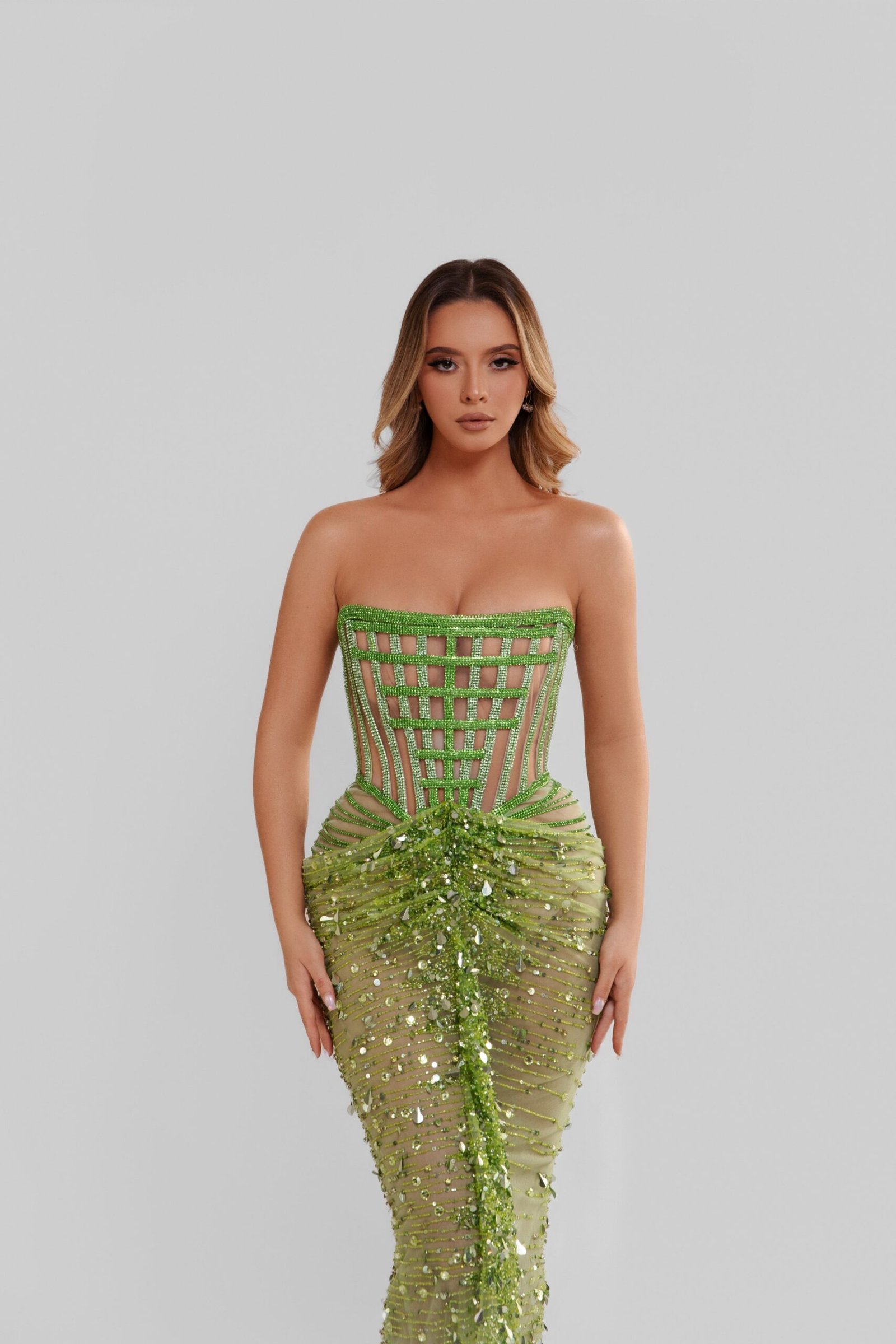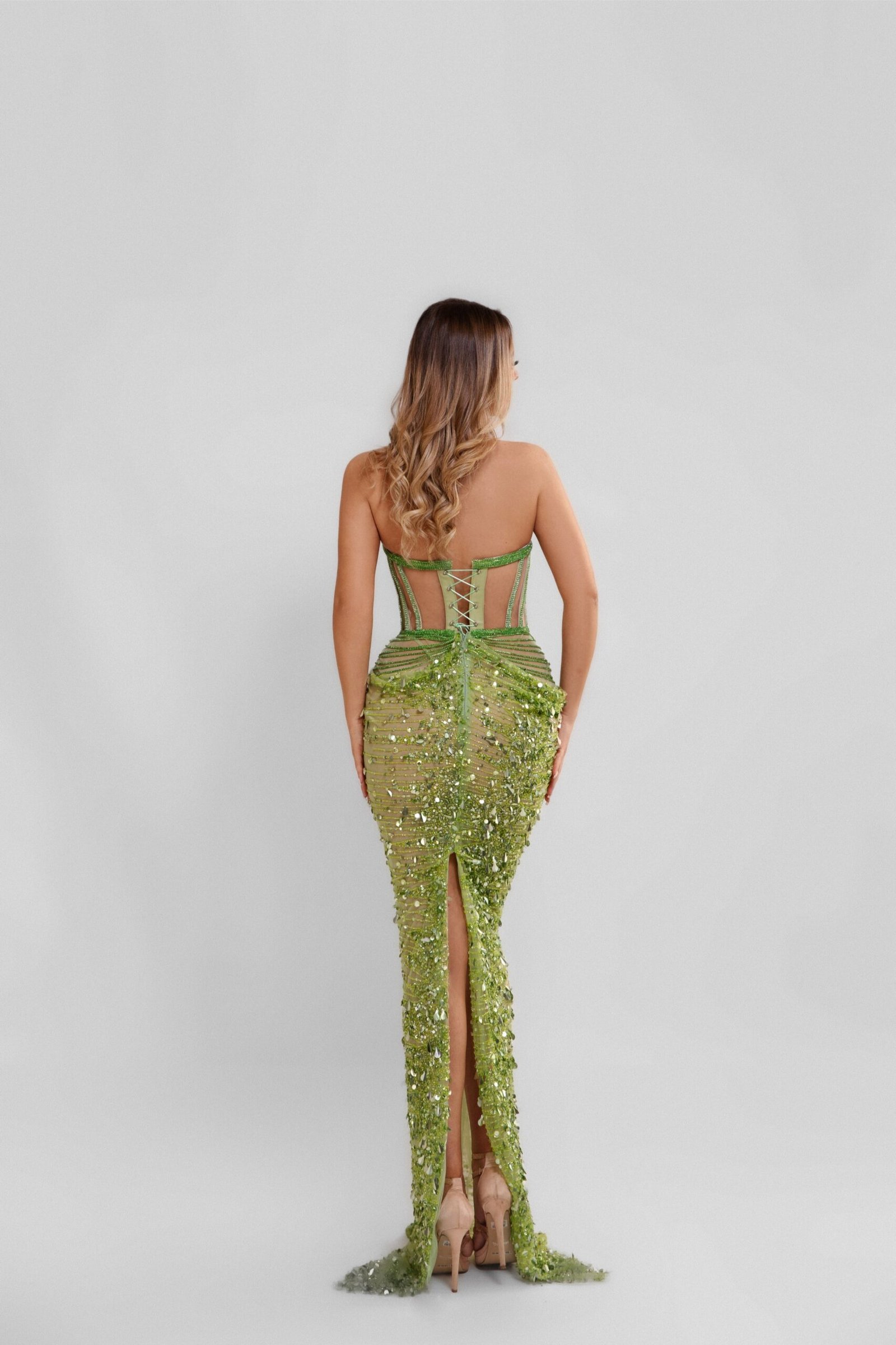 Form-fitting gown that features a corset-style bodice with visible boning, creating a structured look. The HIROO is embellished with sequins and beads, which cascade down the length of the dress, intensifying in concentration towards the hem. The dress is designed to hug the figure closely before flaring out into a mermaid-style train, giving it a classic and elegant silhouette.
