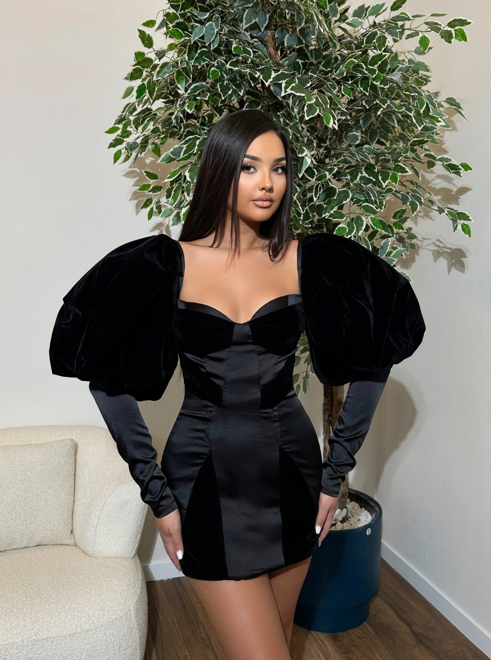 This striking mini dress is a bold statement piece that combines modern design with a touch of drama. The dress features a sleek, form-fitting silhouette in luxurious black satin, accentuating the curves. The standout feature is the voluminous puff sleeves, which add an avant-garde edge to the look.