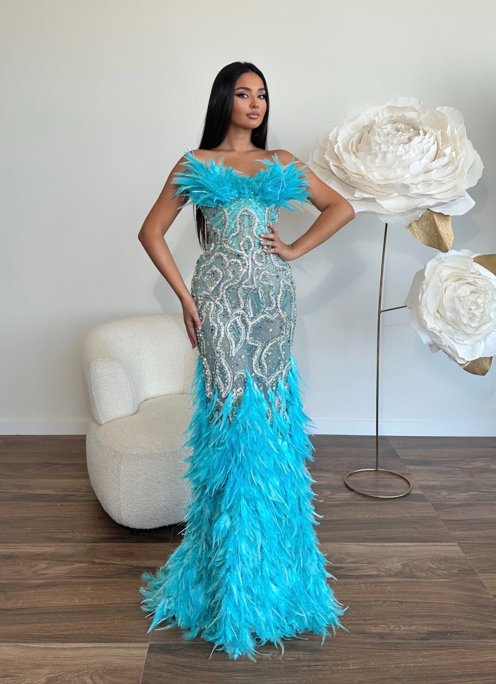 This dress is a breathtaking evening gown that embodies luxury and bold sophistication. The dress features an strapless neckline adorned with vibrant feather embellishments in a matching blue hue, which adds both texture and a dramatic flair to the overall design. The bodice is intricately detailed with silver beading and sequins, arranged in a flowing, organic pattern that enhances the figure and creates a captivating, shimmering effect.