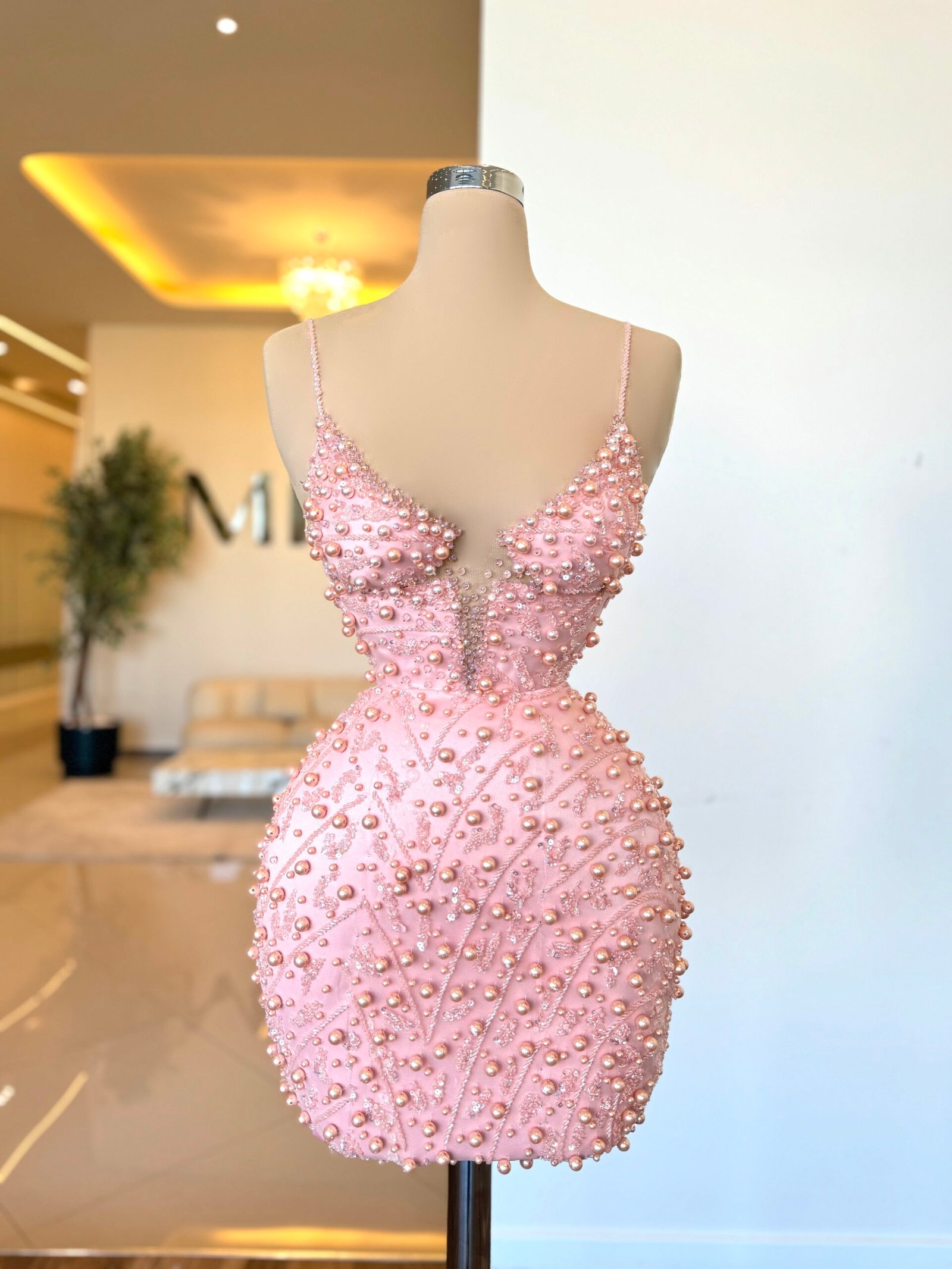 This dress has a sleek and elegant silhouette, accentuating the figure with a fitted design. The bodice features a delicate V-shaped neckline supported by thin straps, while the entire dress is adorned with intricate patterns of round embellishments. The decorations are arranged in flowing, organic lines, giving the piece a luxurious and refined texture. The overall shape is both classic and modern, blending minimalism with detailed craftsmanship.