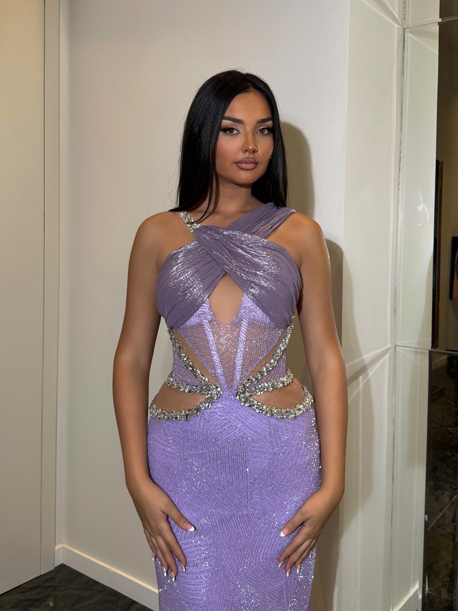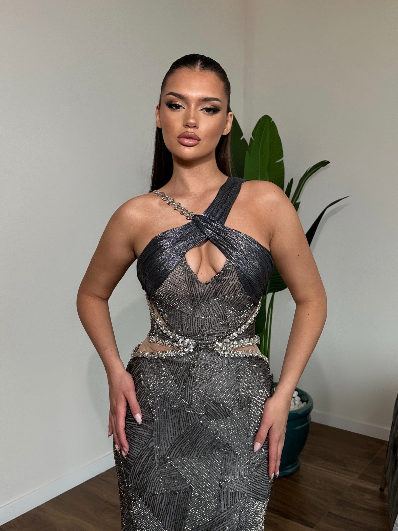 A form-fitting gown featuring a halter neckline with a crisscross detail at the bust, leading into a band that wraps around the waist. The dress is intricately embellished with beads and sequins, creating a radiant, textured surface. The design includes a cut-out at the midriff and continues with a fitted skirt that flares into a slight train at the back.