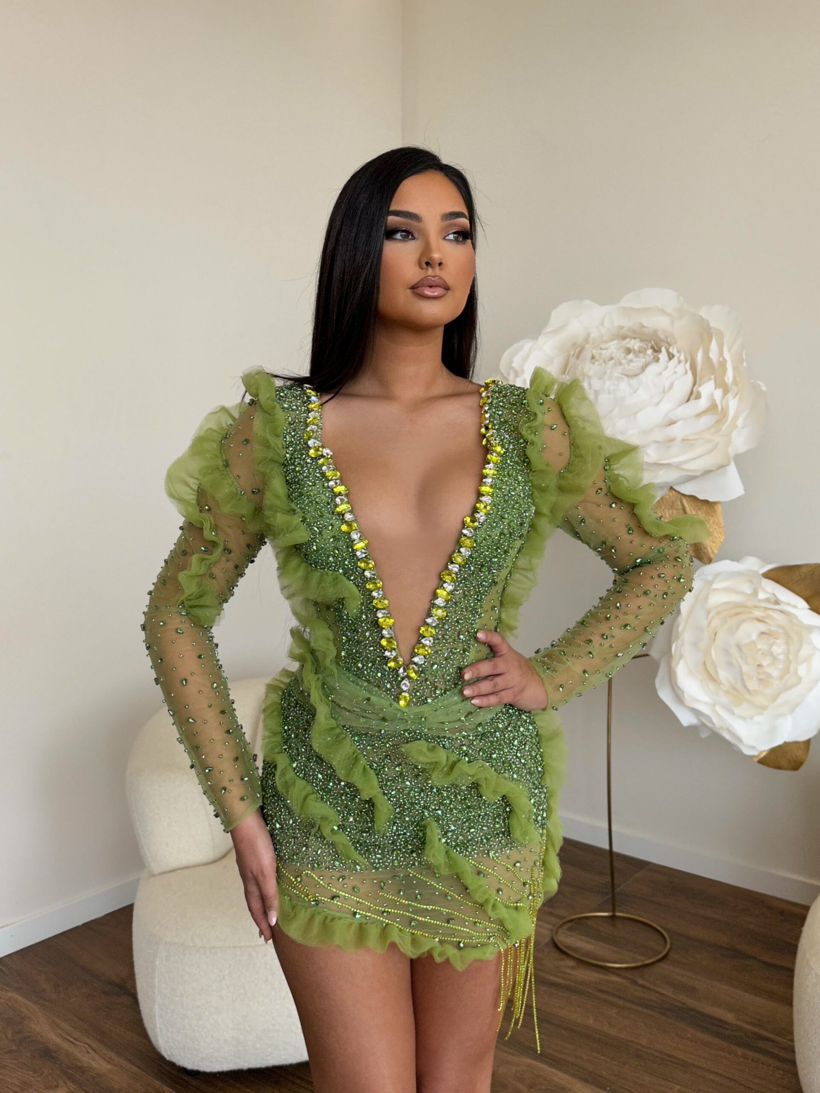Our “Lars” dress is rich in texture, from the crystal details to the sheer fabric and ruffle accents, making it a standout garment for events where fashion-forward and eye-catching attire is celebrated.