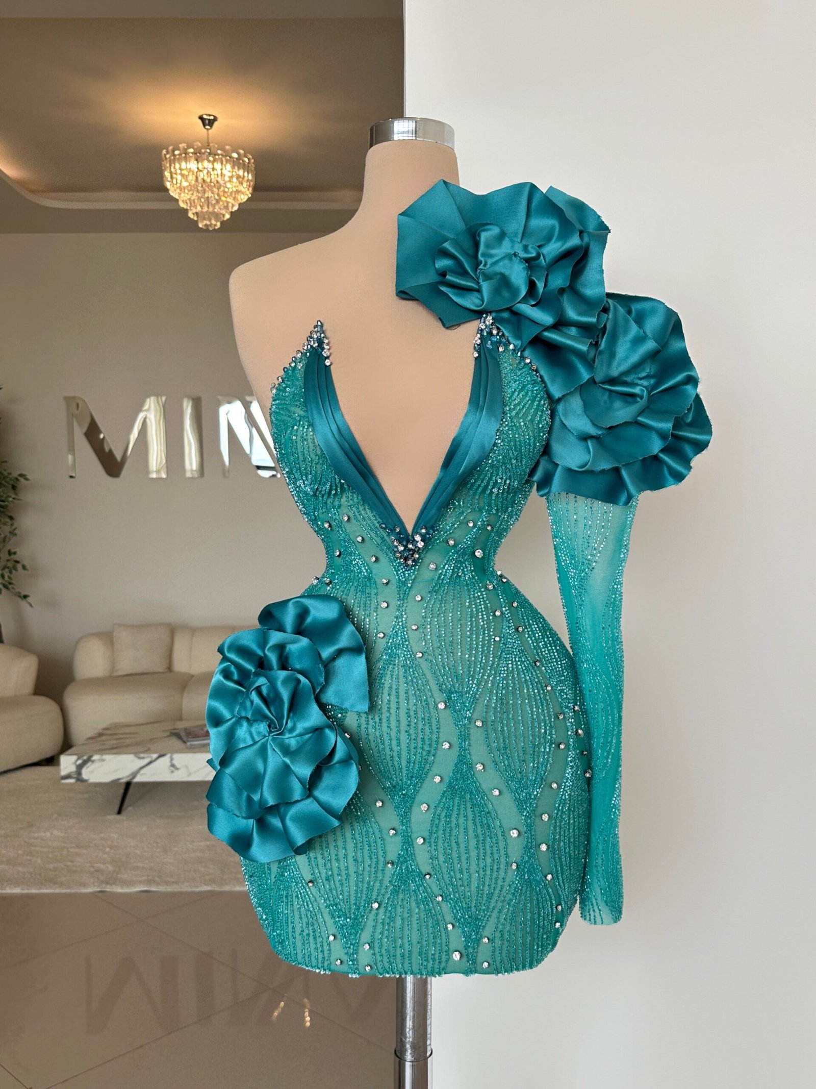 This attire is a short cocktail dress in a rich turquoise color, designed to captivate attention. The dress features a deep V-neckline, full of sparkling embellishments that trace along the edges, imparting a sense of luxury. Three-dimensional rosettes adorn the single shoulder strap and waist, providing a dramatic element to the piece.