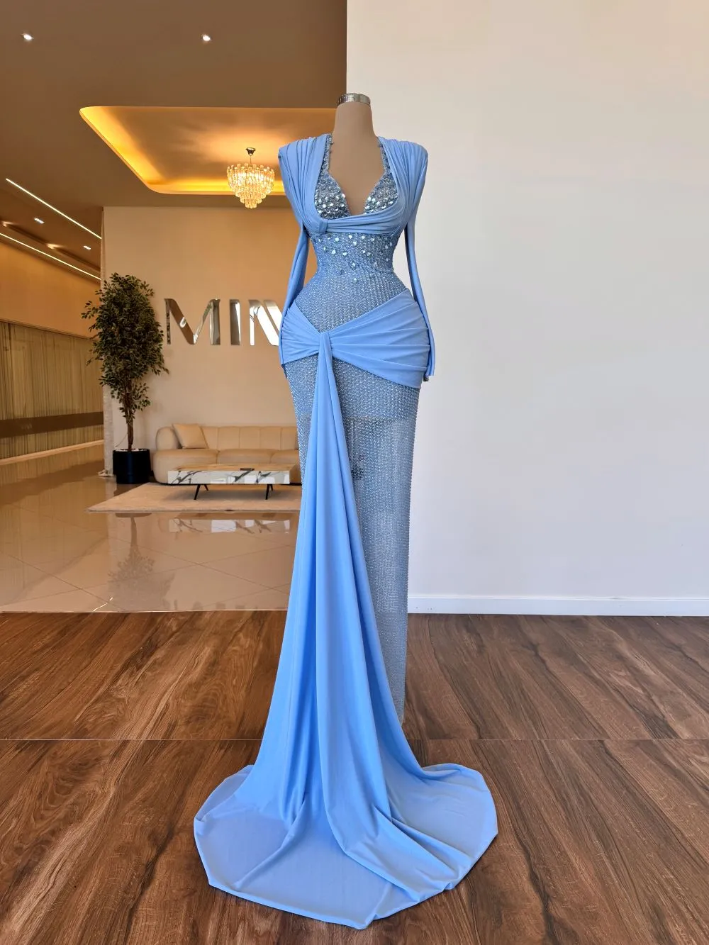 A form-fitting baby blue long dress design in a soft, pastel blue hue. It features intricate beadwork and embellishments on the bodice, creating a sparkling, glamorous effect. The deep neckline is highlighted by draped fabric that gracefully wraps around the shoulders, adding a touch of sophistication. A sleek, semi-sheer skirt showcases a shimmering, embellished layer underneath, and the dramatic floor-length train adds a sense of grandeur and luxury. The silhouette emphasizes the waist with a structured, wrap-like detail, enhancing its flattering fit. Perfect for formal occasions or red carpet events, this dress radiates elegance and modern haute couture vibes.