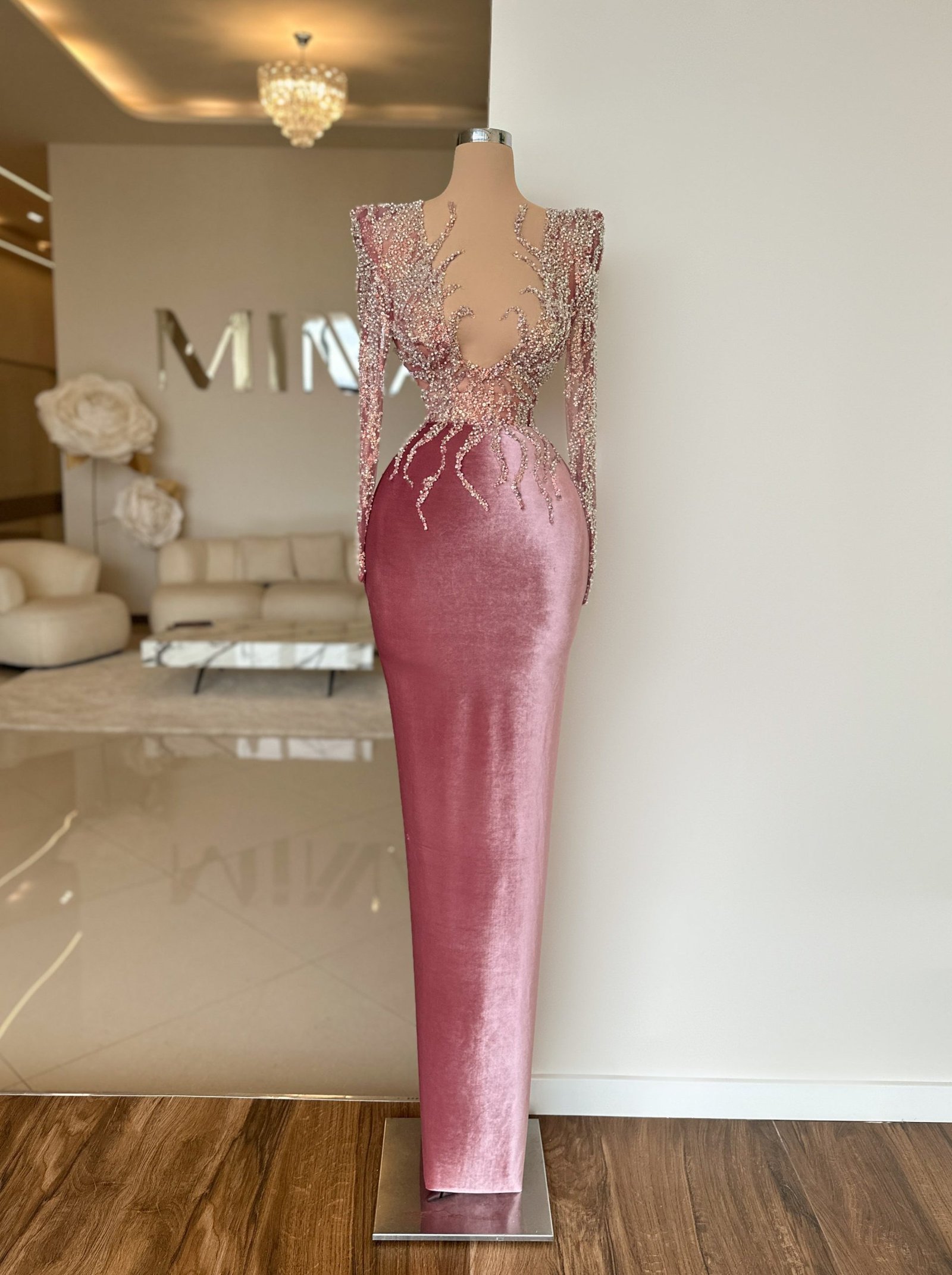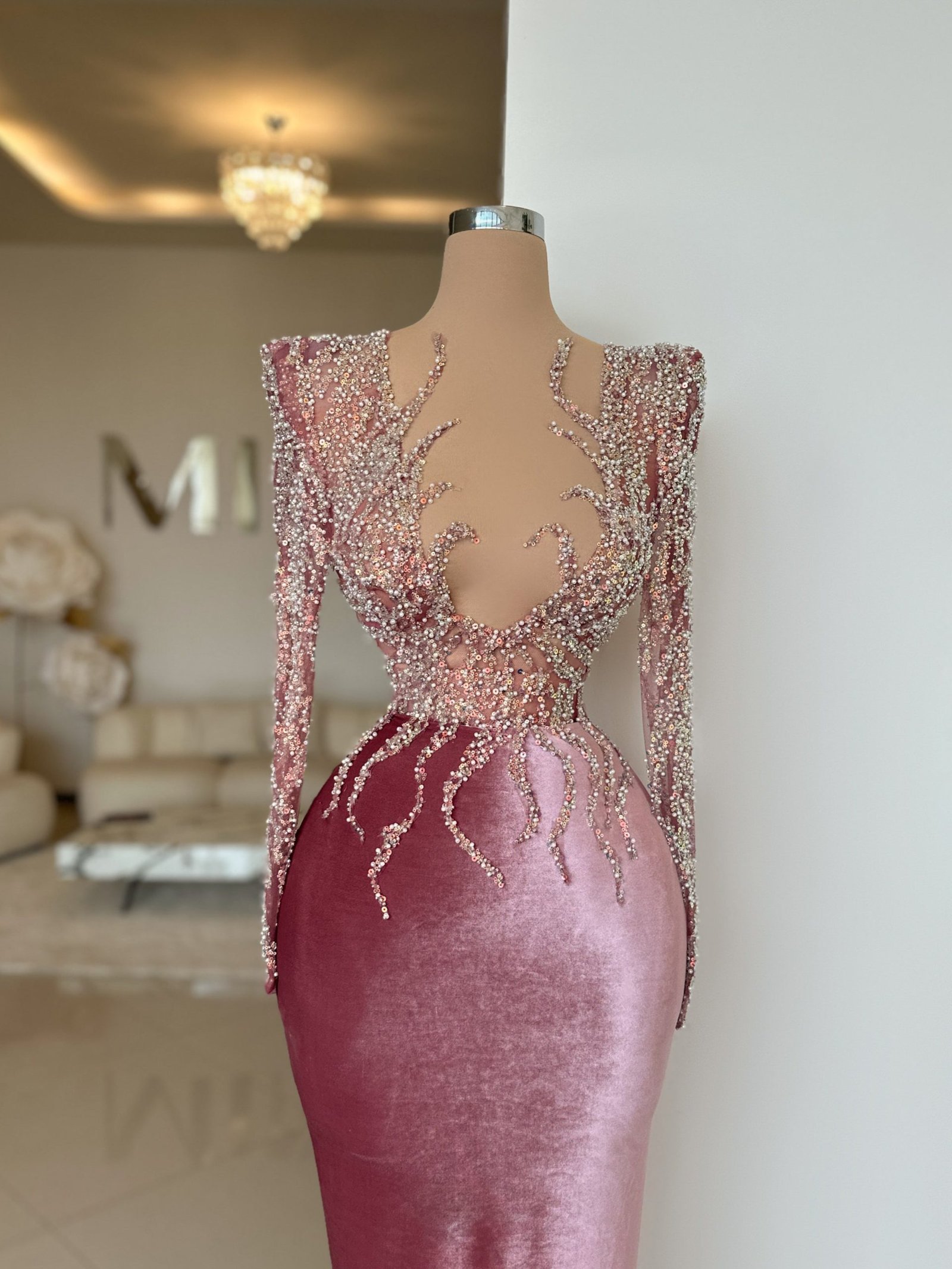 The beadwork, all shimmering, contrasts beautifully against the velvet, making the dress a breathtaking piece for any formal occasion.