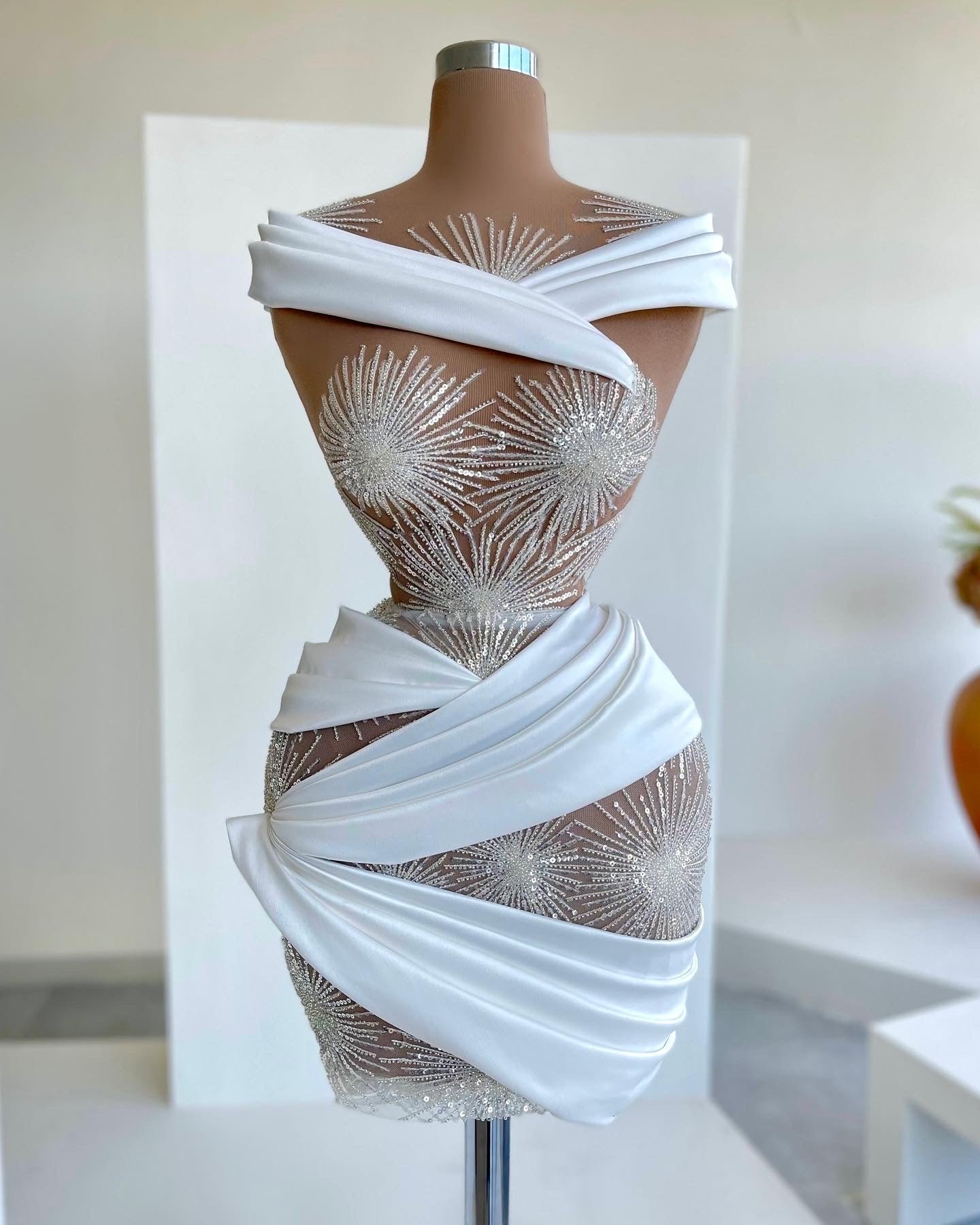 The “Tayla” short white dress features white off-shoulders, white draped at the bottom of the dress, and silver sequins on the bust and underneath the white draped pieces, which are the special feature of this draped white dress.